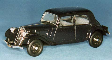 シトロエン11CVは1930〜50年代のフランスの有名車です。エレール1/43はタイヤのパターン等がなかったり問題のあるキットの様ですが資料が少なかったのでほぼストレートに作りました。なお、このシトロエンも色々バリエーションがある様で、同じ1/43でソリッド社から出ているミニカーの方が戦争映画や戦時中の写真で見かけるポピュラーなタイプの様です。なお、マッチボックスから1/32で出ているタイプはオープントップの珍しい型です。リジェールとかトラクション・アバン等という呼び名もあった様です。(fmoのライブラリには2CVと登録されていますが、多分「11」を「II」と勘違いしたのでしょう(^^;)。) |