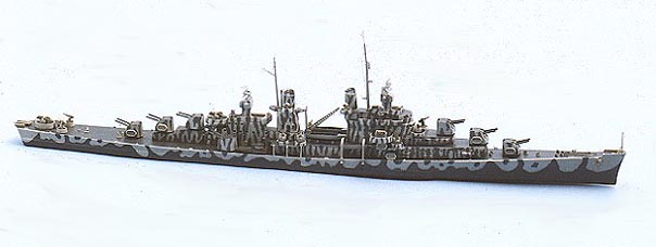 上の写真は透明青色セロハンの上に模型をおいて撮影したものです。セロハンはクシャクシャにしないでそのままの状態で敷いています。割りと実感が出せたと思いますが、水平線の位置と波の大きさは研究の余地がありそうです。下の写真は1997年のNifty模型フォーラムの展示会の際に係の会員の方に撮影して頂いたものです。こちらの方が照明やピントは奇麗ですね。感謝です。このキットは以前はピットロード社から洋上模型として発売されていましたが、現在は艦底部品と飾り台付きでドラゴン社から発売されています。基本形に今一歩問題があるのが残念なキットでした。 |