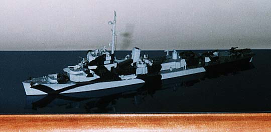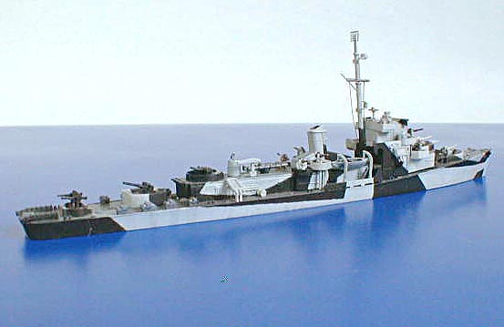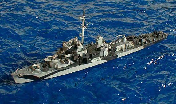 バックレイ(DE-51)はバックレイ級護衛駆逐艦の1番艦です。1943年に竣工しました。1944年頃の状態にしてあります。この艦は1944年5月5日にU66に体当たり攻撃をし、これと映画さながらの組み討ち戦を演じ、沈めています。大戦を生き延び、1968年に除籍されました。 このキットは一部カノン級と部品を共通にした為、無理の出ている所もありますが、それを除いては素組みでOKの好キットです。 上の写真はクシャクシャにした透明青セロハンの上に模型を置いたものです。やはり波が大きすぎて実感を損ねていますが、水平線が見えない角度での撮影なので、その意味ではそれなりの「らしさ」は出ているかもしれません。 下の写真は青のカッティングシートを敷いた上で撮影したものです。波の殆どない感じと水平線が綺麗な直線に近い感じになっているし、撮影角度が良かったせいか割りと実感が出たと思いますが、何かもの足りない様な気もします。 最下の写真は普通のカメラで撮影しプリントしたものをスキャナで読み込んだものですが、やはりあまり精細な画像になっていません。もとが普通カメラによるストロボ撮影である事、サービスサイズプリントのものである事を差し引いてもです。これを見ると、パソコンでの表示用にやはりデジタルカメラで撮影したものが最適という気がしてきます。 |