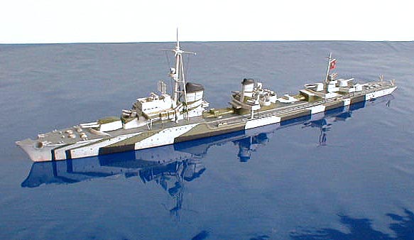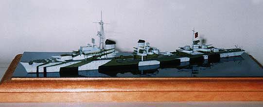 Z-37はZ級駆逐艦1936年A(臨戦)型の5番艦です。1943〜44年頃の状態にしてあります。ノルマンジー上陸作戦時の海戦に参加したZ-32にしても良かったのですが、Z-37の方が斜め前方からみた写真があったのでこれにしました。Z-37は1944年8月にボルドーにて自沈しています。まともにこのクラスにしようとすると結構手間がかかるキットです(現在はタミヤからリリース)。 上の写真は透明青の塩ビ板の上に透明青のセロハンを敷いたものの上で撮影しました。下の写真は普通のカメラで撮影、プリントしたものをスキャナ入力したもので画質は悪いですが、飾り台の全景が分かるので参考に入れてあります。飾り台は市販のデコパージュの上に黒と透明青の塩ビ板を重ねて貼りつけたものですが、割りと手軽に海面の感じが出せるので重宝しています。 |